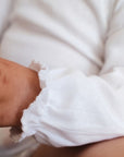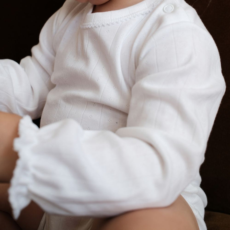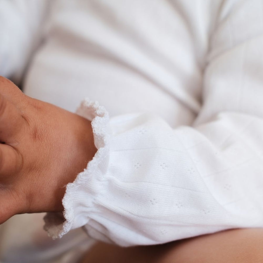 Each piece features a beautiful pointelle design, adding a subtle touch of texture and charm that feels both nostalgic and timeless. The fresh white tone suits every little one and brings a gentle elegance to any wardrobe. It’s easy to care for, holds up beautifully in the wash, and pairs effortlessly with anything — making it a go-to for busy days, gentle moments, and everything in between.